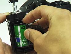 裏蓋が開いたら次にフィルムの装填をします。 巻き戻しクランクを上げて、フィルムをフィルム室に入れます。 (巻き戻しクランクは2段階になっていますが、フィルムを装填するときは完全に引き上げて下さい) フィルムを入れたらクランクを押し下げてパトローネをセットします。