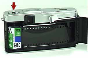 フイルムをセットしたら、巻き戻しノブを下げてフイルムを固定し
