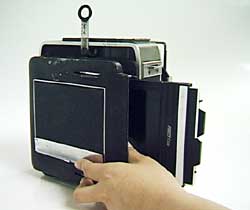 シートフィルムをセットしたフィルムホルダーをピントグラスとボディの間に挟むようにしてセットします。