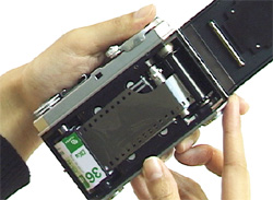 フィルムの先端をスプールに差し込み、フィルムのパーフォレーションがスプロケットと噛み合っているかを確認し、フィルムを巻き上げます。