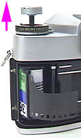 ボディ側部の丸いボタンを押しながら上に押して蓋を開け、フィルムを装填します。