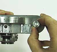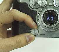 撮影終了後のフィルムの取り出し方です。 レンズ左下にあるフィルム巻き戻し切り替えダイヤルをREWINDに合わせます(写真:左)。 そのあと、右上のフィルム巻き戻しノブで巻き戻します(写真:右)。 完全に巻き戻したら、底面のボタンを押し、裏蓋を開け、フィルムを取り出します。