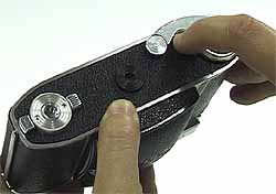 フィルムを取り出すときは、まずフィルム巻き上げレバーの横についているボタンを押します。