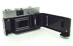 それでは使い方を見ていきましょう。 まずはフィルムの装填です。 ボディを後側から見て左側面にある留め金を上に引き、裏蓋を開けます。